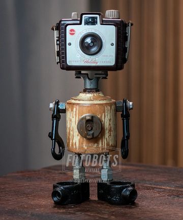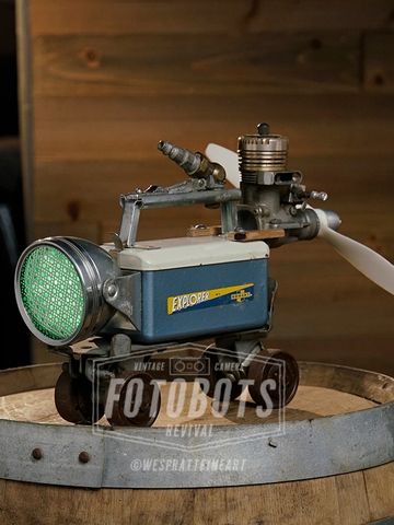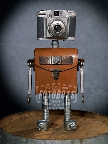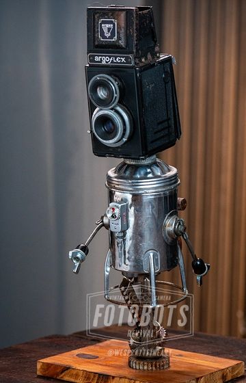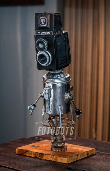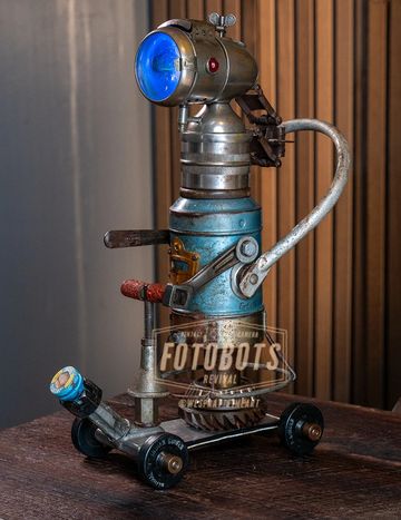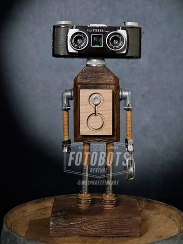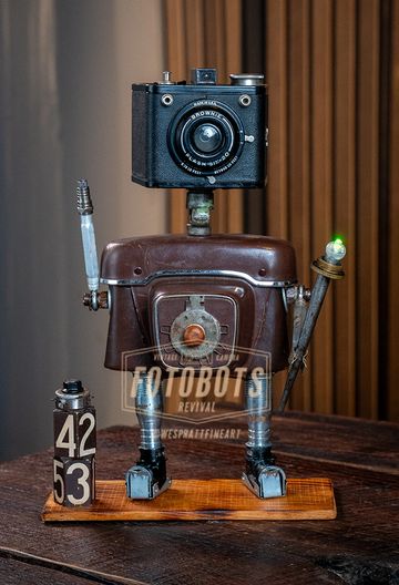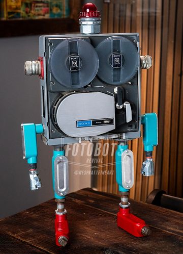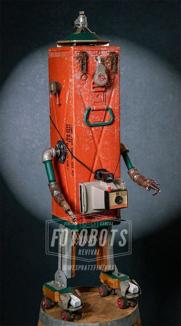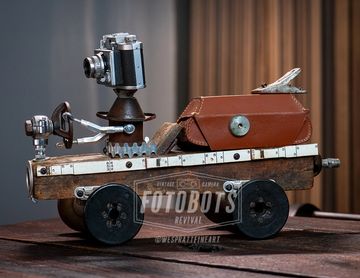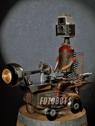 Design elements: Two Camera's (head & body), lawn blades, metal vice crank, vintage roller skate, textile piece, salvage wood & metal parts, and LED Lights.