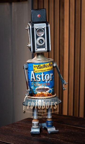 Design elements: Camera, Astor coffee can, vintage textile quills & metal salvage parts.